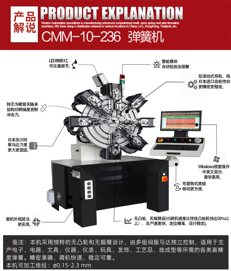 本機型適用于生產(chǎn)電子、電器、文具、儀器、玩具、發(fā)飾、工藝品、線成型等高難度精密彈簧。