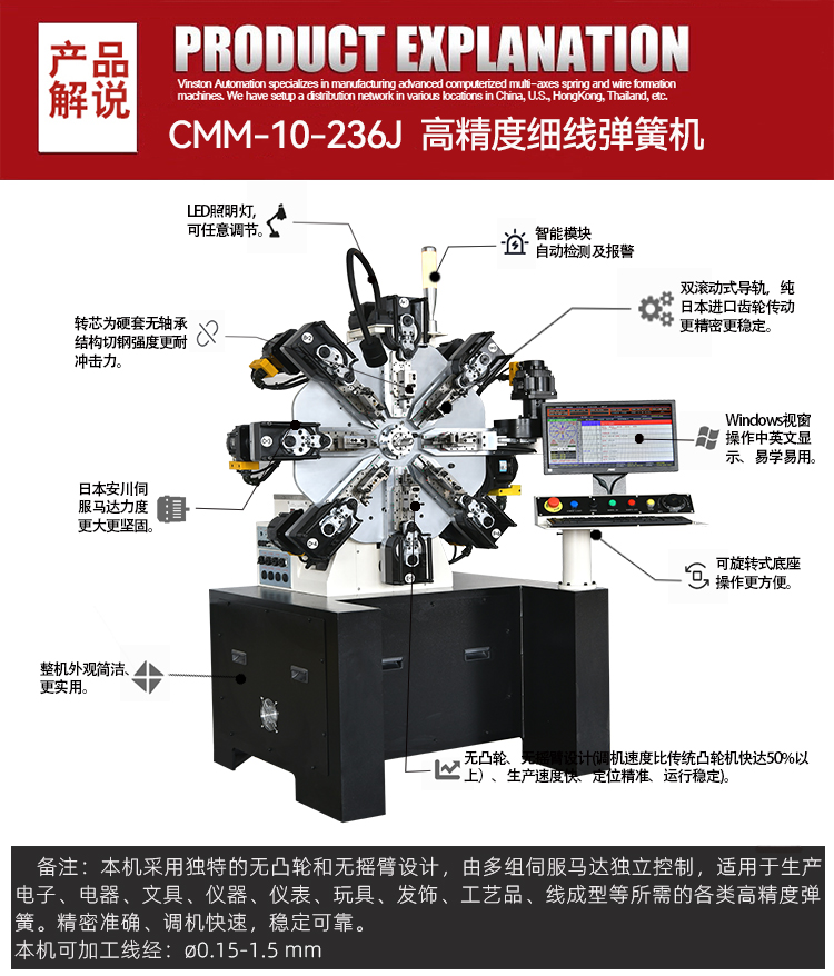 本機型適用于生產(chǎn)電子、電器、文具、儀器、玩具、發(fā)飾、工藝品、線成型等高難度精密彈簧。