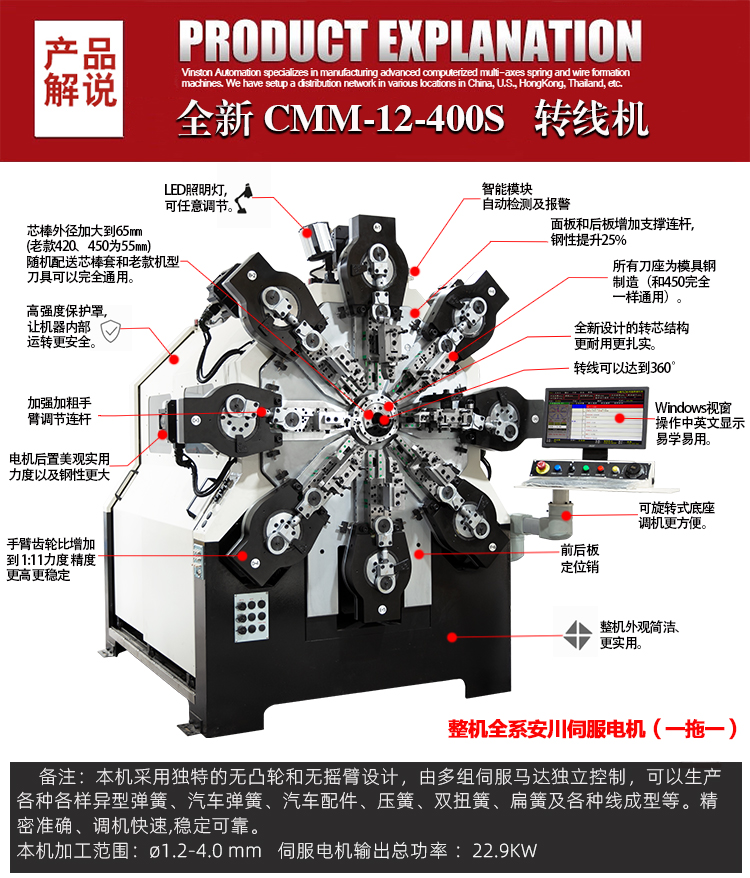• 產(chǎn)品概述: CMM-12-400S 轉(zhuǎn)線彈簧機(jī)可生產(chǎn)?1.2-4.0 mm線徑彈簧及線成形等),本機(jī)采用獨(dú)特的無凸輪和無搖臂設(shè)計(jì),由多組伺服馬達(dá)獨(dú)立控制,可以生產(chǎn)各種各樣異型彈簧、汽車彈簧、汽車配件、壓簧、雙扭簧、扁簧及各種線成型等。精密準(zhǔn)確、調(diào)機(jī)快速、穩(wěn)定可靠。