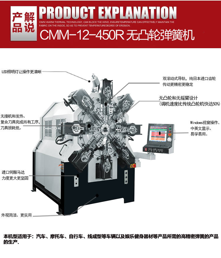 其次,永騰無(wú)凸輪彈簧機(jī)上無(wú)滾動(dòng)式導(dǎo)軌,可長(zhǎng)久保持精度。無(wú)撞機(jī)和發(fā)熱,復(fù)合刀具完成所有工序,工具損耗低。適用于汽車(chē)、摩托車(chē)、自行車(chē)、線成型等車(chē)輛以及娛樂(lè)健身器材等產(chǎn)品所需的高精密彈簧的產(chǎn)品的生產(chǎn).