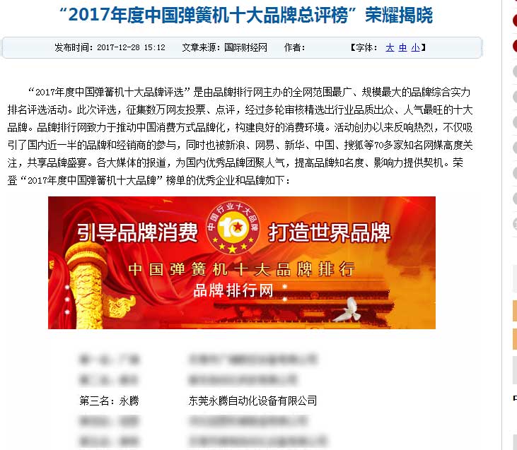 永騰榮獲2017年度中國彈簧機十大品牌日期:2018-01-05???? 人氣:1594