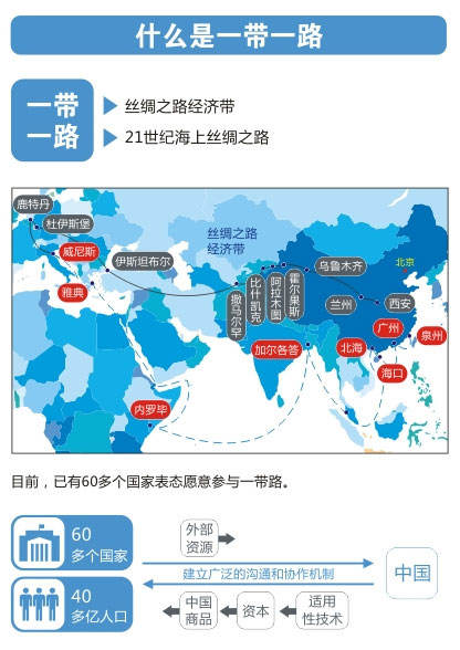 一帶一路(One Belt And One Road,簡(jiǎn)稱OBAOR;或One Belt One Road,簡(jiǎn)稱OBOR;或 Belt AndRoad簡(jiǎn)稱,BAR)是“絲綢之路經(jīng)濟(jì)帶”和“21世紀(jì)海上絲綢之路”的簡(jiǎn)稱,2013年9月和10月由中國(guó)國(guó)家主席習(xí)近平分別提出建設(shè)“新絲綢之路經(jīng)濟(jì)帶”和“21世紀(jì)海上絲綢之路”的戰(zhàn)略構(gòu)想.