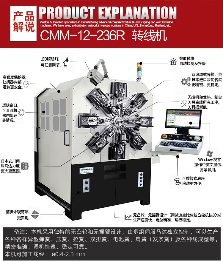 • 產品概述: CMM-12-236R 轉線彈簧機.可生產?0.4-2.3 mm線徑彈簧及線成形等)本機采用獨特的無凸輪和無搖臂設計,由多組伺服馬達獨立控制,可以生產各種各樣異型彈簧、壓簧、拉簧、雙扭簧、電池簧、扁簧(發(fā)條簧)及各種線成型等。精密準確、調機快速、穩(wěn)定可靠。